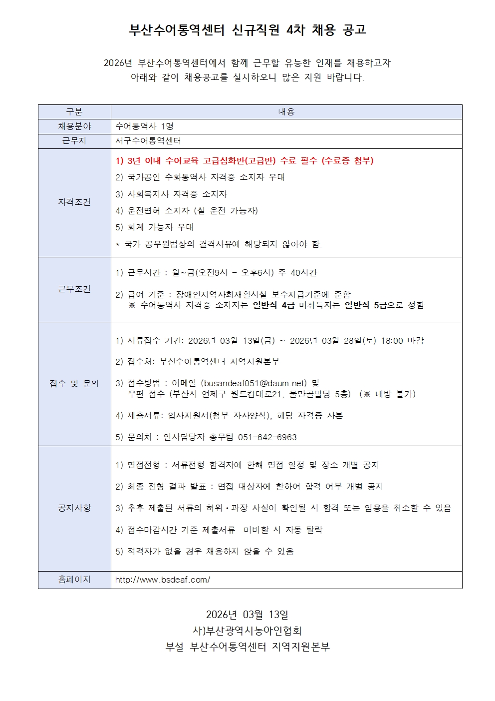 부산수어통역센터 신규직원 4차 채용공고