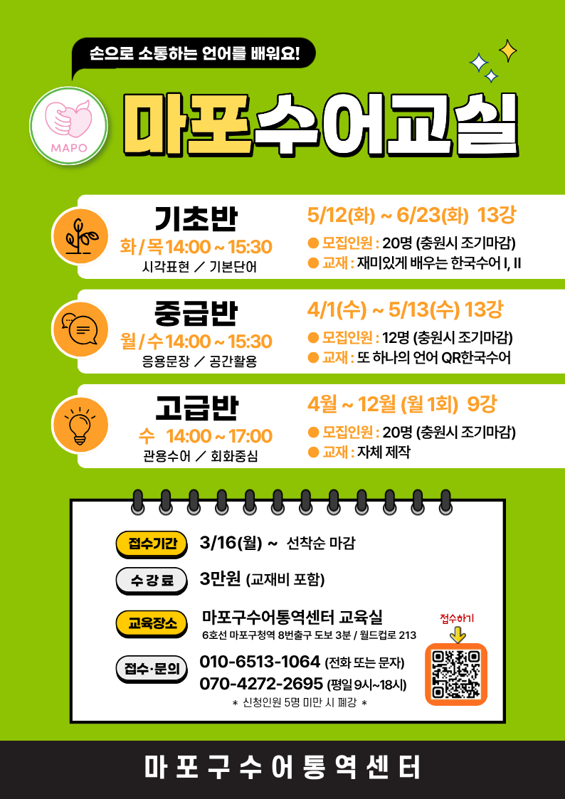 [마포구수어통역센터] 4~5월 수어교실(기초반, 중급반,고급반) 개강 안내